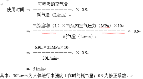 当气瓶内空气压力为25MPa时,呼吸器的理论使用时间可按以下公式进行计算: