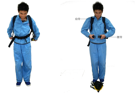 ※背上整套装置,双手扣住身体两侧的肩带D型环,身体前倾,向后下方拉紧D型环直到肩带及背架与身体充分贴合。
