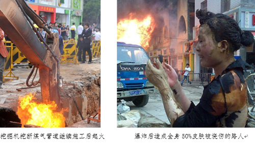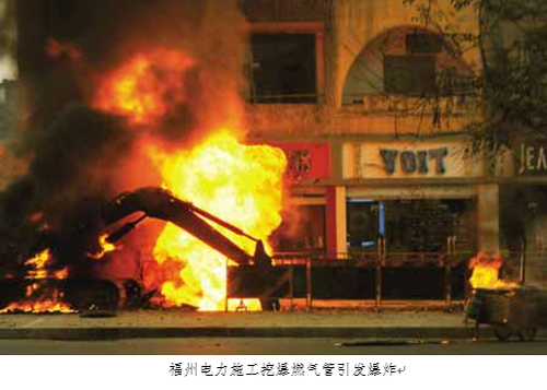 实例:2011年5月24日上午,福州市仓山区上三路和首山路交叉路口,一辆属福州电力的挖掘机在施工时将燃气管道挖破导致燃气泄漏。