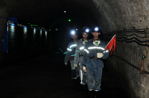 图为该矿采煤一队生产班班长带领班组打旗入井
