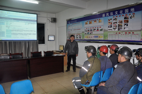 图为该矿通风队瓦检班开展班前会算安全“五笔帐”活动