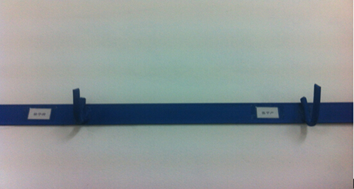 2、用Φ8钢筋制作40*40钩子,并焊接在40的扁铁上,钩子间距300mm,钩子数量根据岗位人员定制,并在扁铁和钩子上用漆刷刷蓝色油漆。