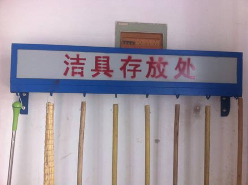 6、制作每字为110*110的黑体“洁具存放处”等字模具,字间距10mm,用自喷漆喷涂在白色薄铁皮中间位置。