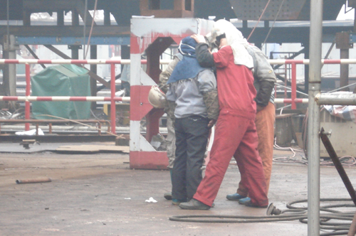 车间员工打磨作业,突然一位打磨员工眼睛被飞溅的铁砂射入,旁边正在作业的三四位同行立即放下手中正在打磨的砂轮机,围聚上来帮助眼睛飞入铁砂的同事清理飞砂。