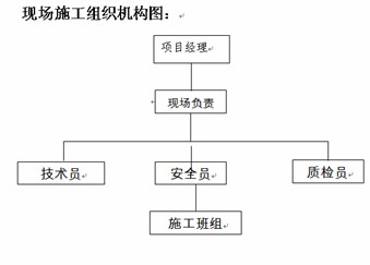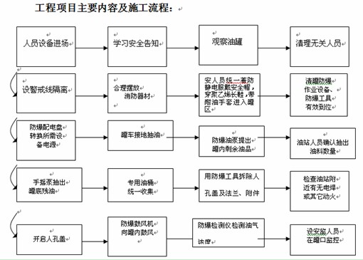 (4)作业准备:清罐作业单位至少应编制施工组织设计、HSE作业计划书、应急预案等文件。拟定的作业方案经加油站所属公司相关部门人员审核合格、书面批准后,清罐作业单位到安全管理部门办理临时用电作业许可证、进入装置作业许可证、进场施工通知书等相关手续,准备好清罐作业所需的相关设备。用带防爆电机的抽油泵或手摇泵排出油罐底油,并将含油污水进行必要回收后,排入油水分离池,以免引起环境及水土污染。罐底含油污水排完后,用防爆通风机,将罐内空气进行置换。最后向油罐注入清罐用水进行清洗。必要时,清理罐底沉淀物作妥善处理。消防器材应在有效期内,且配置数量应符合现场需要。如下2图为一清罐作业单位的施工方案中的现场施工组织机构图和施工流程图:
