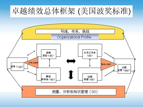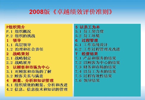 总结:《卓越绩效准则》的核心是“做正确的事、正确的做事和持续改进”, 推行《卓越绩效模式》的关键是建立企业自己的“管理模式”或“商业模式”,企业必须以顾客和市场为中心,建立工作系统和工作工程。以战略为主线推进企业发展,以绩效测量和绩效考核为基础,通过P-D-C-A不断改进,以员工为本,进行“人本”管理,以良好的企业文化为“空气”,创造“和谐、激活、创新”型的组织,企业从小到大、从优秀到卓越。