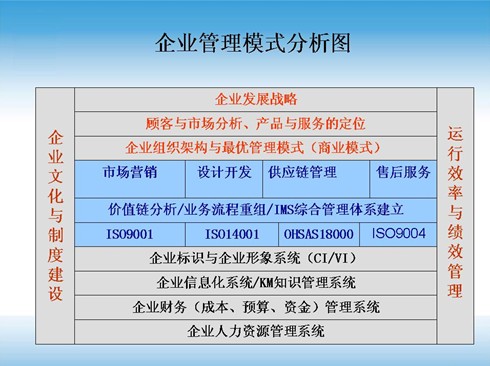每个企业根据行业、顾客和产品的不同形成自己特殊的工作系统和工作流程,我们可以通过价值链分析、业务流程分析等方式理顺我们的工作系统和工作流程,虽然每个企业业务流程差别较大,但基本上是由“市场营销、设计开发、供应链管理和售后服务等环节”构成。我们通过推行ISO9001质量管理体系,建立起以顾客为关注焦点流程系统,同时还要不断消除技术壁垒和提升企业的管理水平,建立ISO14001环境管理体系和OHSAS18001职业健康和安全管理体系。通过精益生产、5S管理、TPM、六西格玛技术来改进流程,不断追求“两高一低”——质量高一点、效率高一点、成本低一点。因此流程是企业运营管理的核心。