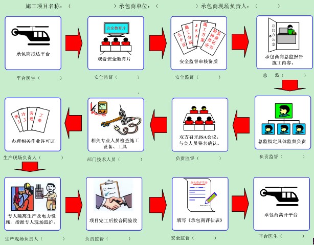 (2)承包商现场作业负责人每日作业开工前,要向平台负责人汇报,经过平台负责人检查确认后,方可开工;