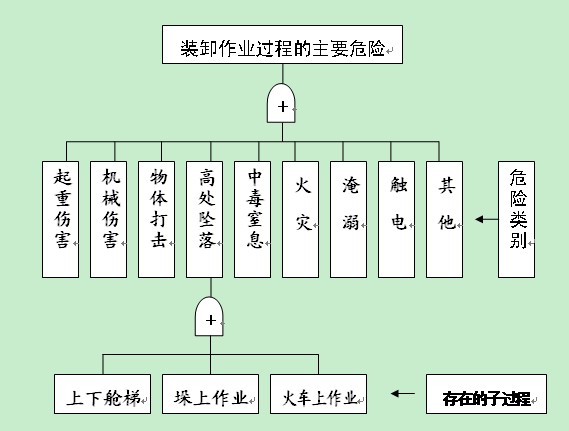 2、确定危险存在的过程或环节。按流程展开被检查对象的作业过程、设备的基本结构等,分析这些危险存在的子过程或环节,如高处坠落可能发生在下舱、上垛、火车顶上等装卸作业过程的子过程(如上图《装卸作业过程危险源分析》)等等。