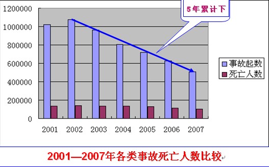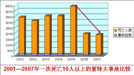 而2007年共发生各类事故506376起,死亡101480人,是2004年以来连续第四个下降年;比事故高峰年份的2002年减少37913人,5年累计下降27.2%。发生一次事故死亡3-9人的较大事故起数和死亡人数与上年相比分别下降10.6%和9.4%。全年发生了86起10人以上事故,其中30人以上特大事故7起。我们的4项指标,与先进国家相比仍然比较落后。以亿元GDP事故死亡率为例,2005年是0.7,2006年是0.558,2007年是0.413,确实降了很多,但是和发达国家比,我们差不多是人家的10倍,与韩国前几年的水平比较接近。有关情况请见下面得图示说明: