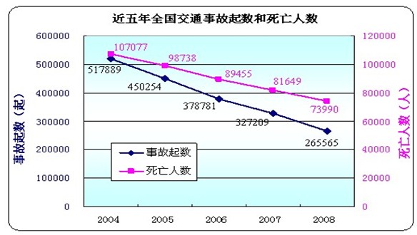 2008年全国安全事故总量413752起, 死亡人数91172人,比上年减少92456起、10308人,分别下降18.3%和10.2%。亿元GDP事故死亡率由上年的0.413降到0.312,降幅24.5%。
