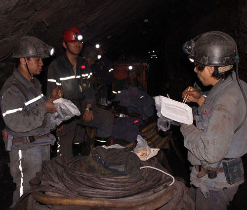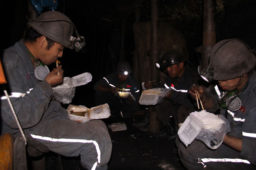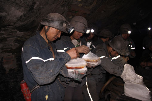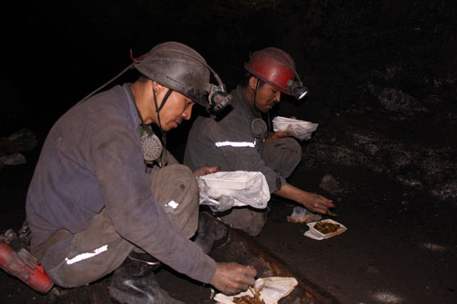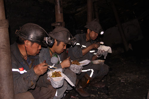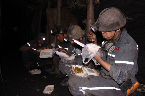 图为小河嘴煤矿2012采煤面的职工正在享用协管员们配送的班中餐。