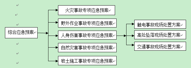3)岩土施工作业过程中基坑边坡失稳坍塌的风险等级为“高度危险”,触电、机械伤害风险等级为“显著危险”,因此岩土施工专项预案明确为基坑坍塌专项预案,其他风险的应对在人身伤害专项预案中已经包含。