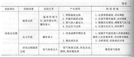 回收系统主要保护加氢催化剂,严防空气进入系统,造成飞温。严防氢气泄漏,氢气压力高,一旦泄漏很容易被静电引燃,酿成重大事故。正常生产时危险因素分析和防范措施见表